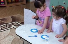 Икенче кечкенәләр төркемендә тәрбияләнүчеләр “Су һәм һава тарихы” циклыннан “Суда нәрсә булды?” темасына танып белү-тикшеренү шөгыле үткәрделәр. Балалар су үзлекләренең берсе белән таныштылар.