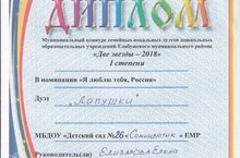Безнең шәһәребездә Алабуга муниципаль районының мәктәпкәчә белем бирү учреждениеләре гаиләләре арасында традицион булган “Ике йолдыз – 2018” җыр дуэтлары бәйгесе узды. Безнең балалар бакчасыннан әлеге конкурста “Лапушки” гаилә дуэты катнашты (музыка җитәкчесе Елизарова Елена Анатольевна).