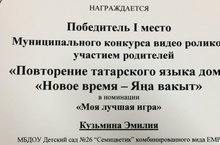 В Елабуге прошел конкурс видеороликов с участием детей дошкольного возраста и их родителей «Повторение татарского языка дома «Новое время-Яңа вакыт». От нашего детского сада в конкурсе приняли участие 4 семьи. Все они достойно представили свою работу по воспитанию детей в духе национальной культуры.