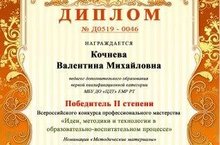 Педагог дополнительного образования МБУ ДО "ЦДТ" ЕМР РТ Кочнева Валентина Михайловна получила диплом II степени во Всероссийском конкурсе профессионального мастерства "Идеи, методики и технологии в образовательно- воспитательном процессе" в номинации "Методические разработки".