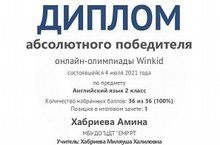 04.07.2021 обучающаяся объединения "Первые шаги" Хабриева Амина приняла участие в олимпиаде по английскому языку Winkid и стала абсолютным победителем. "Беренче адымнар" берләшмәсе укучысы Хәбриева Әмина 4 нче июль көнне инглиз теленнән узган Winkid олимпиадасында катнашып, абсолют жиңүче булды.