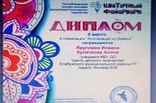 Поздравляем учащихся объединения «Мир творчества» (руководитель Кочнева В.М.) Яруллину И. и Куличкову А. с победой в Республиканском конкурсе- выставке декоративно – прикладного творчества «Цветочный фейерверк».
