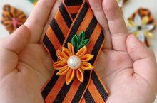 Одним из символов Победы является Георгиевская лента. Можно сложить ленту традиционным способом или добавить красочных элементов, например, в технике канзаши, и получается целое украшение к празднику. Вот такие броши изготавливают обучающихся объединения "Калейдоскоп творчества" под руководством Хоснуллиной Г.Ф.