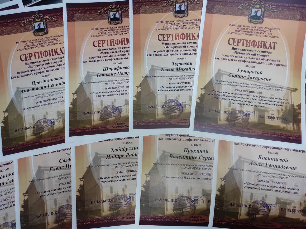 2022 елның 27 сентябрендә балалар техник иҗат үзәгендә "Һөнәри осталык күрсәткече буларак өстәмә белем бирү педагогының методик продукты"дигән муниципаль семинар узды.