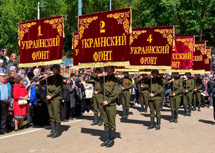Митинг начался с выноса на главную сцену праздника флага Российской Федерации и знамени Победы. За ними последовала знаменная группа, в состав которой вошли студенты Елабужского политехнического колледжа, которые несли 10 штандартов с названиями фронтов.