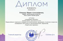Удовенко Мария Александровна, воспитанница МБДОУ «Поспеловский детский сад», Класс, группа: Средняя группа. За 1 место в номинации «Рисунок» (название работы: Лермонтовская осень) Всероссийского творческого конкурса для дошкольников, школьников, студентов и педагогов, посвященного 205-летию со дня рождения М.Ю. Лермонтова «Герой своего времени» и воспитатель МБДОУ «Поспеловкий детский сад» Ефимова Наталья Александровна за подготовку участника в данном конкурсе. / 1 дәрәҗә диплом белән бүләкләнәләр: