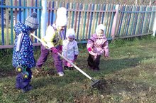 Труд в природе, часто используется, как практический метод ознакомления дошкольников с природой. Основными задачами трудовой деятельности являются ознакомление с трудом взрослых, формирование уважительного отношения к труду, развитие трудовых навыков и умений, необходимых в повседневной жизни. Дети уже в младшем возрасте знают, что все люди трудятся. И в повседневной жизни подражают взрослым, в том числе и в трудовой деятельности. Каждому из ребят хочется принять участие в уборке сухих опавших с деревьев листьев. Они наперебой просят инструменты для уборки территории участка, занимают очередь за граблями, делят территорию; сухих листьев на участке достаточно, поэтому работы хватает для всех! Трудятся дети ответственно, с огромным желанием наводят чистоту и порядок. По окончании работы, как и любой человек, ребёнок ждёт похвалы\Хезмәт табигатьтә, еш кулланыла буларак, практик ысул белән танышу мәктәпкәчә яшьтәге балалар белән табигать. Хезмәт эшчәнлегенең төп бурычлары булып өлкәннәр хезмәте белән танышу, хезмәткә карата ихтирамлы мөнәсәбәт формалаштыру, көндәлек тормышта кирәкле хезмәт күнекмәләрен һәм күнекмәләрен үстерү тора. Балалар инде кече яшьтә үк барлык кешеләрнең дә хезмәт итүен беләләр. Көндәлек тормышта да өлкәннәргә, шул исәптән хезмәт эшчәнлекләрендә дә үрнәк булып торалар. Һәр бала агачлардан коелган яфракларны җыештыруда катнашасы килә. Алар участок территориясен чистарту өчен инструментлар сорый, талау өчен чират алалар, территорияне бүләләр; кишәрлектә коры яфраклар җитәрлек, шуңа күрә эшләр барысы өчен дә җитәрлек! Балалар җаваплы эшлиләр, чисталык һәм тәртипне бик теләп тоталар. Эш тәмамлангач, бала да, һәр кеше кебек үк, Мактау көтә