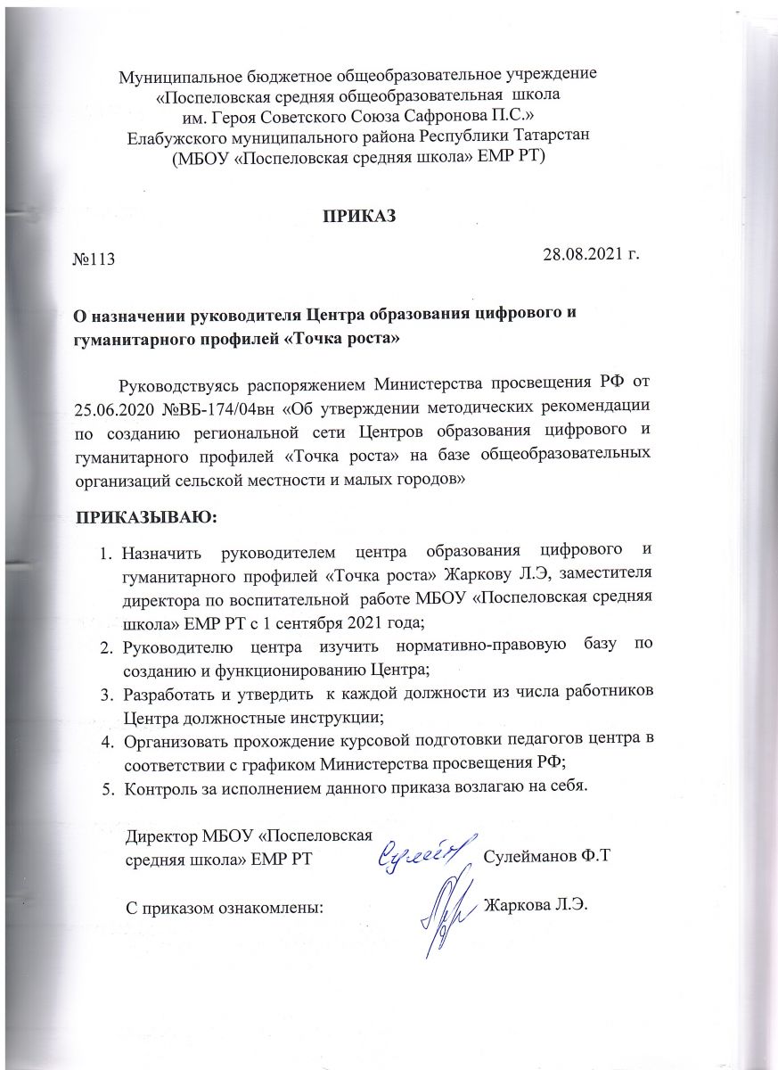 Приказ о назначении руководителя Центра "Точка роста"
