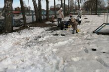 Балалар бакчасы кырыенда калган карларны таратып, тизрәк эрергә булышабыз./Помогаем снегу растаить быстрее.