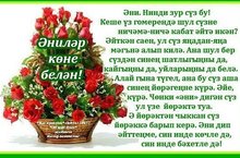 Көннең яктылыгы-кояшта, күкнең матурлыгы-йолдызларда, җирнең гүзәллеге-хатын-кызларда. Сезне бөтен җир йөзен бизәгән Әниләр бәйрәме белән тәбриклибез. Кадерлик без әниләрне, олылыйк! Аларның канатлары каерылмасын, тормыш авырлыкларыннан иңнәре сыгылып төшмәсен! Хатын-кыз һәрвакытта да хатын-кыз булып калсын!/ В этот день хочется сказать спасибо всем мамам на планете за самый лучший подарок — жизнь! Дорогие наши мамы, поздравляем вас с Днем матери и желаем душевных сил, жизненной мудрости, ангельского терпения, женского счастья, взаимной любви и домашнего уюта. Спасибо вам, родные, за то тепло, нежность, ласку и заботу, которые вы так искренне нам отдаете. Желаем вам, наши дорогие, всегда и везде чувствовать себя нужными и любимыми.