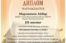 «Чыршыны урманда калдырыйк» дип аталаган муниципаль шигырь конкурсында катнашып, 29 чыгышчы арасыннан Айдарыбыз 3че урынны яулады.Афәрин, Айдар!/В муниципальном конкурсе «Оставим елочку в лесу» со стихом Айдар завоевал 3 место. Так держать, Айдар!