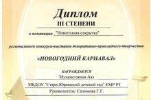 На Региональный конкурс-выставку поступило 407 работ декоративно- прикладного творчества и изобразительного искусства. 19 разработок Новогодних внеклассных мероприятий и мастер-классов. 20 Новогодних стихотворений на английском языке. Творческие работы в номинации «Рисунок». Новогодние рисунки -это уникальные рисунки. Дети, когда занимаются творчеством, они тем самым создают праздник, как для себя, так и для взрослых. Ребята с удовольствием красками, мелками нарисовали свои мечты и желания. Наш Аяз занял 3 место./Төбәк конкурс-күргәзмәгә декоратив-гамәли иҗатка һәм рәсем сәнгатенә караган 407 эш килде. 19 эш-Яңа елга багышланган класстан тыш чаралар һәм мастер-класслар эшкәртмәләре. 20 эш - инглиз телендә язылган Яңа ел шигырьләре. “Рәсем” номинациясендәге иҗат эшләре. Яңа елга багышланган рәсемнәр - алар уникаль эшләр. Балалар, иҗат белән шөгыльләнгәндә, үзләре өчен дә, өлкәннәр өчен дә бәйрәм ясыйлар. Балалар бик теләп буяулар, акбурлар белән үз хыялларын һәм теләкләрен ясадылар. Аязыбыз 3че урынны яулады.