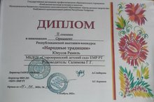 "Халык йолалары" дип иcемләнгән республика күргәзмә конкурсында катнашып (барлыгы 265 эш иде), "Орнамент" номинациясендә Юнусов Рамилебез икенче, "Халык курчагы" номинациясендә Байкин Фәнзилебез өченче степеньле дипломга лаек булдылар. Афәрин, балалар!/ Республиканской выставки-конкурса "Народные традиции" (всего 265 работ) в номинации "Орнамент" Юнусов Рамиль был награжден второй степени, а в номинации "Народная кукла" Байкин Фанзиль третий степени диплома. Молодцы, дети!