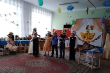 1 октябрь көнне балалар бакчасында эшләп лаеклы ялга чыккан хезмәткәрләрне бәйрәм кичәсенә чакырдык.Балалар үзләренең матур җырлары,шигырьләре,шаян биюләре белән өлкәннәрнең күңелен күрде.Өлкәннәр бик канәгать булып өйләренә таралдылар./1 октября мы пригласили в гости пожилых сотрудников нашего детского сада. Дети выступили со своими стихами,песнями,веселыми танцами.Пожилые ушли довольными.