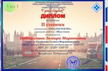 III Бөтенрәсәй конкурсы “I speak English”.Инглиз телендә шигырь укучылар бәйгесендә Набиуллина Зәмирә II дәрәҗә диплом белән бүләкләнде.Котлыйбыз!