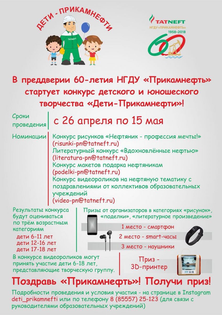 В преддверии 60-летия НГДУ "Прикамнефть" с 26 апреля по 15 мая проводится конкурс детского и юношеского творчества "Дети - Прикамнефти". Условия участия и призы для победителей