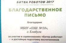 Поздравляем с ПОБЕДОЙ Латыпова Динара, Тазиева Рината, Зотина Светозара, Акманова Артура, Чернову Анастасию в соревнованиях «Битва роботов» в детском технопарке «Кванториум» г.Набережные Челны и наставника Попырину Елену Павловну за высокий уровень воспитанников