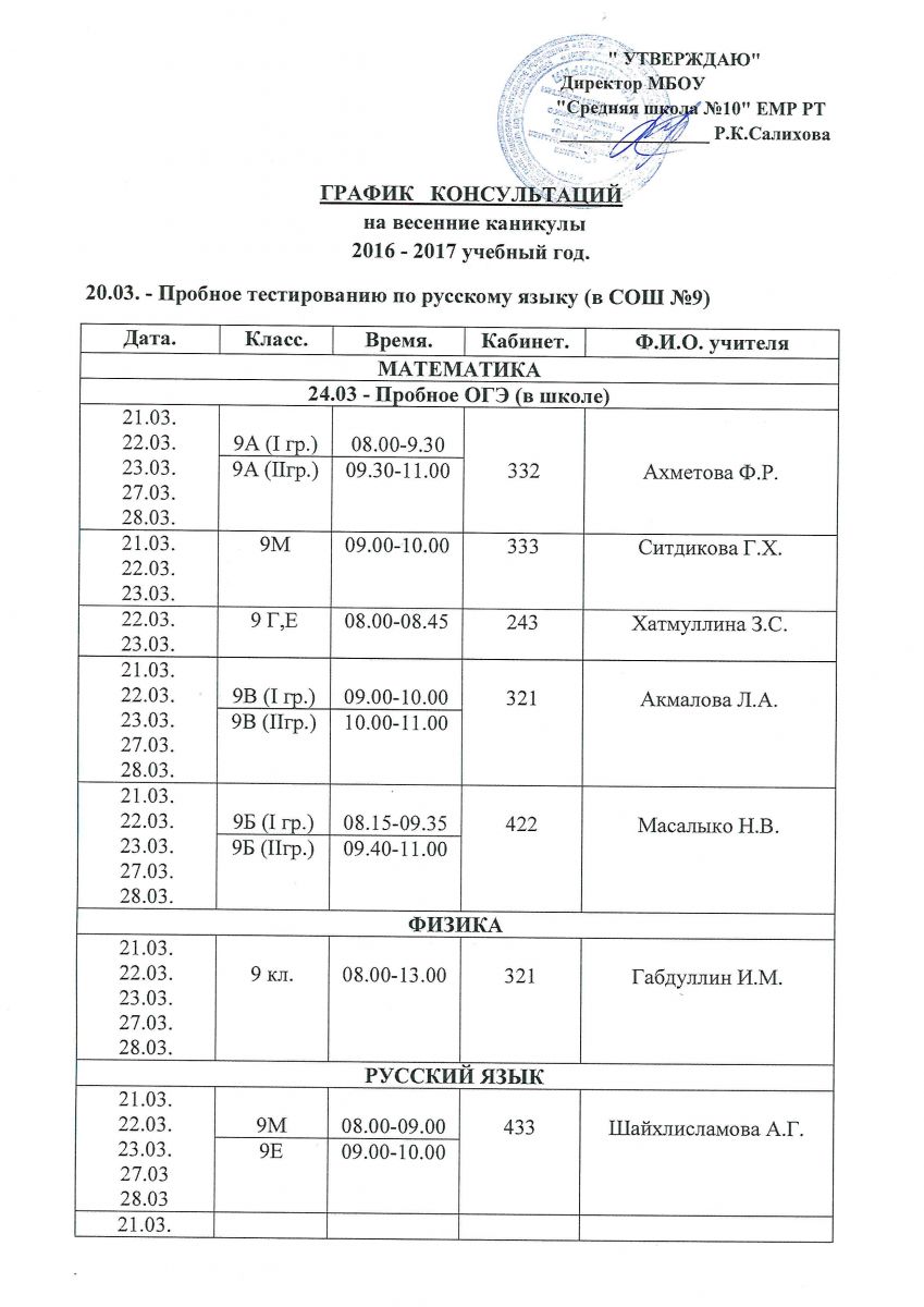 Графики консультаций по подготовке к ОГЭ и ЕГЭ во время весенних каникул