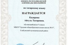 Поздравляем Кадирову Айгуль, ученицу 9 класса, ставшую призером республиканской олимпиады по татарскому языку, и Абзалову М.Н., учителя татарского языка и литературы за подготовку призера.