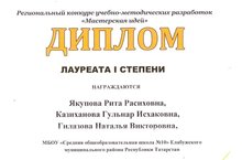 Башлангыч сыйныф укытучылары Якупова Р.Р., Казиханова г. и., Гыйләҗева Н. В. «Идеяләр остаханәсе» «Укыту-методик эшләнмәләр региональ конкурсында класстан тыш чараның методик эшкәртмәсе» номинациясендә җиңү яулаганы өчен котлыйбыз.