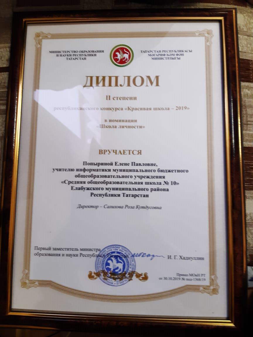 Поздравляем учителя информатики Попырину Елену Павловну с победой в номинации «Школа личности» Республиканского конкурса «Красивая школа».