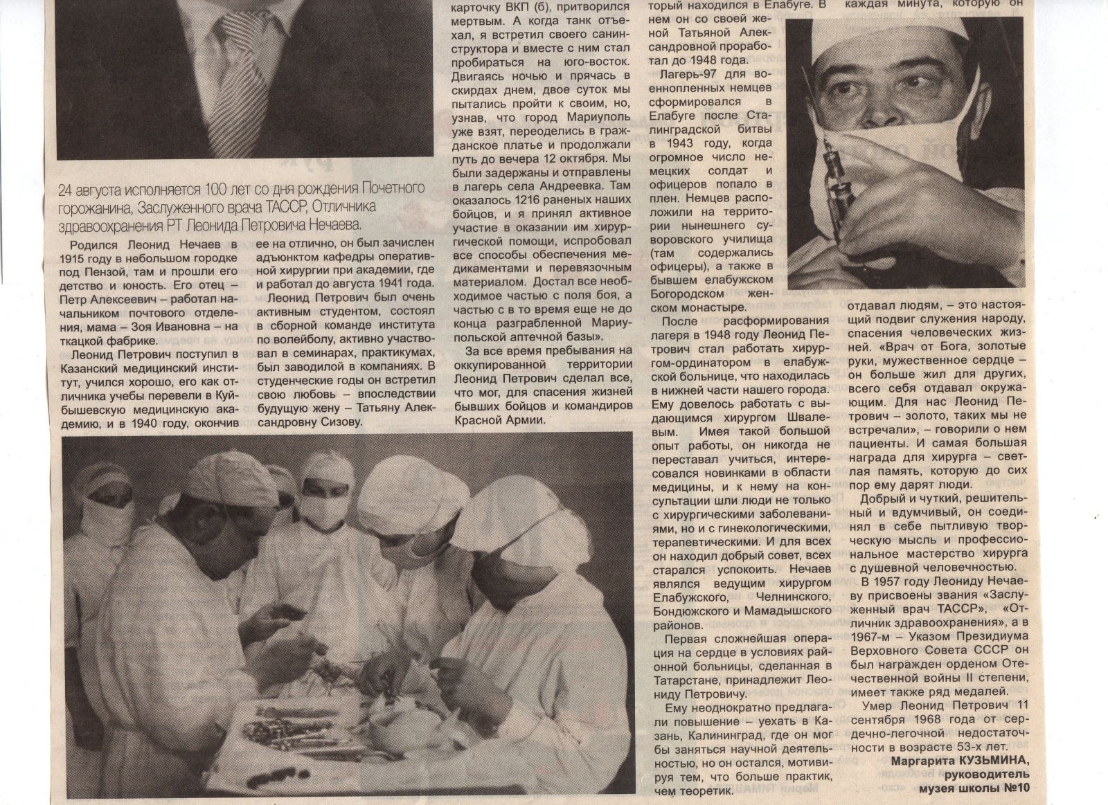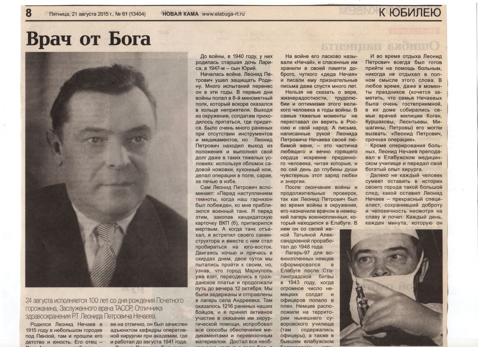 ►Кузьмина М. Великий хирург Леонид Нечаев// Вечер Елабуги - 2015. - август - Посмотреть