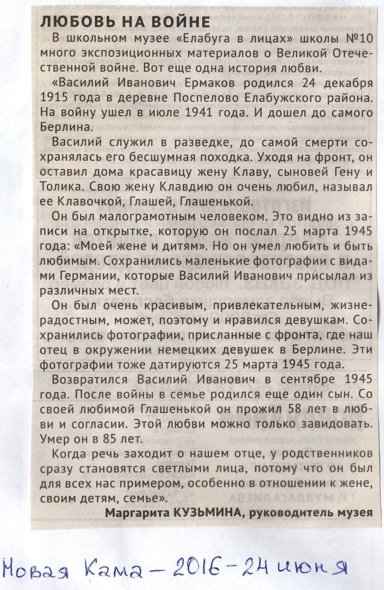 ►Кузьмина М. Любовь на войне// Новая Кама. - 2016. - август - По материалам школьного музея "Елабуга в лицах" - Посмотреть