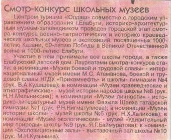 ►Яшь буын геройларны белергǝ тиеш // Алабуга нуры. - 2015. - 30 январь - Учащиеся 8Б класса под руководством учителя истории, руководителя школьного музея "Елабуга в лицах" Кузьминой М.Н. и зав.библиотеки Мишиной Е.Н. ведут проектную работу "Знать героев поименно" Посмотреть