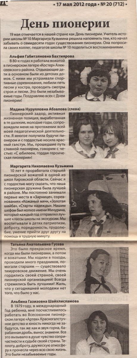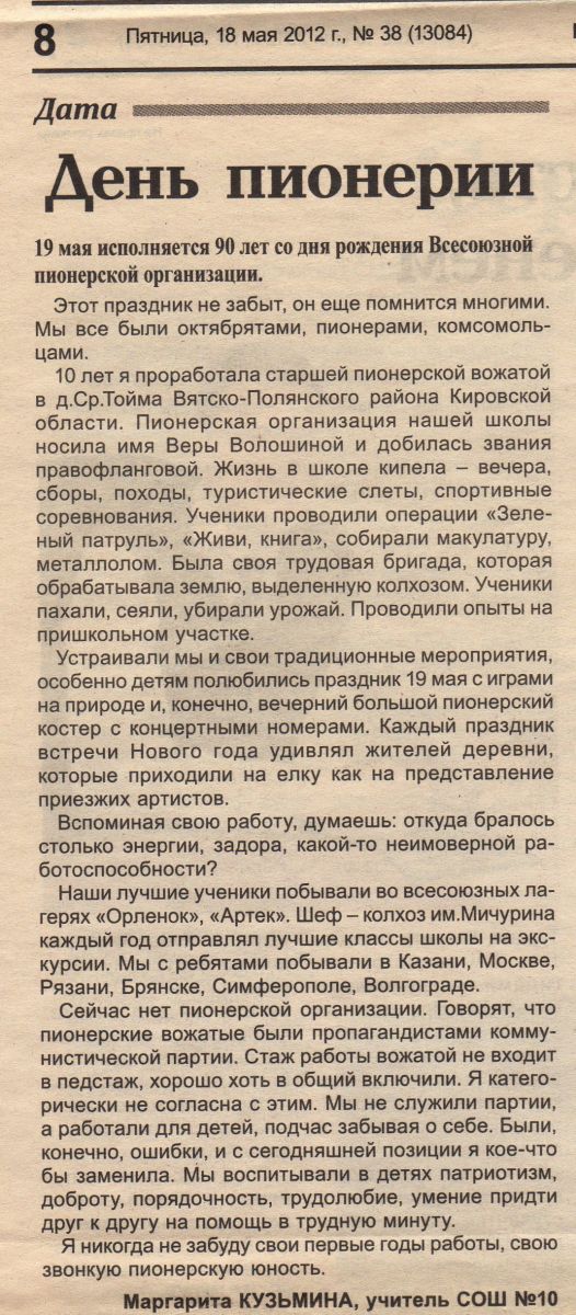 ►Кузьмина М.Н. День пионерии // Вечер Елабуги. - 2012. - 17 мая. - С. 7 - воспоминания педагогов школы, посвященные пионерии - посмотреть, продолжение