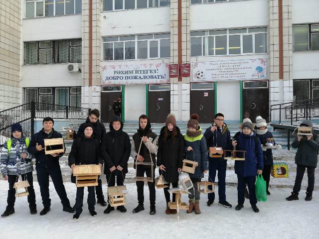В школе прошла акция "покорми птиц зимой".Начальные классы совместно с родителями приготовили кормушки, а 8-параллель их с удовольствием развесила.