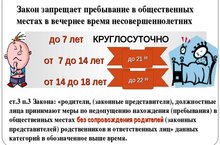 ЗАПРЕЩЕНО В НОЧНОЕ ВРЕМЯ (промежуток времени с 21 часов до 6 часов в период с 1 сентября по 31 мая включительно или с 22 часов до 6 часов в период с 1 июня по 31 августа включительно) находиться несовершеннолетним без сопровождения родителей или лиц, осуществляющих мероприятия с участием детей.