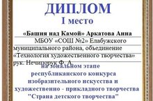 Поздравляем Аркатову Анну, ученицу 6А класса с победой на зональном этапе республиканского конкурса изобразительного искусства и художественно-прикладного творчества "Страна детского творчества" в рамках XIX Международного фестиваля "Детство без границ" в номинации "Путешествия по миру".