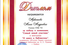 Поздравляем Аркатову А., ученицу 6А класса с победой в викторине "О книге и библиотеке" в номинации "Самый юный участник", посвященной 120-летию Первой городской Публичной библиотеки им. А.С. Пушкина. Молодец!