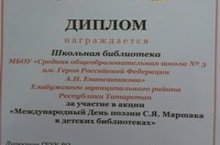 Школьная библиотека приняла участие в акции «Международный День поэзии С.Я.Маршака в детских библиотеках», организованной Воронежской областной детской библиотекой. Подведены итоги проведения данной акции. Наша школа награждена Дипломом за участие. Благодарим школьного библиотекаря Наталью Анатольевну Рыбакову.