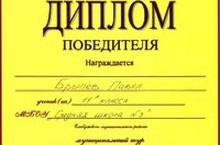 11.04.13 г. на базе школы №9 состоялся муниципальный тур XVII республиканского конкурса «Юный программист». Для участия в конкурсе были представлены 5 номинаций: «Программные продукты», «WEB – сайты, WEB - проекты», «Компьютерный дизайн», «Компьютерная презентация, созданная в Prezi», «Мобильные приложения». Наш ученик 11 класса Брылёв Павел занял 1 место в номинации «Программные продукты», его работа, как и работы остальных победителей, будет заявлена для участия в республиканском конкурсе. Пожелаем ему удачи и дальнейших побед! МОЛОДЕЦ!!!