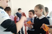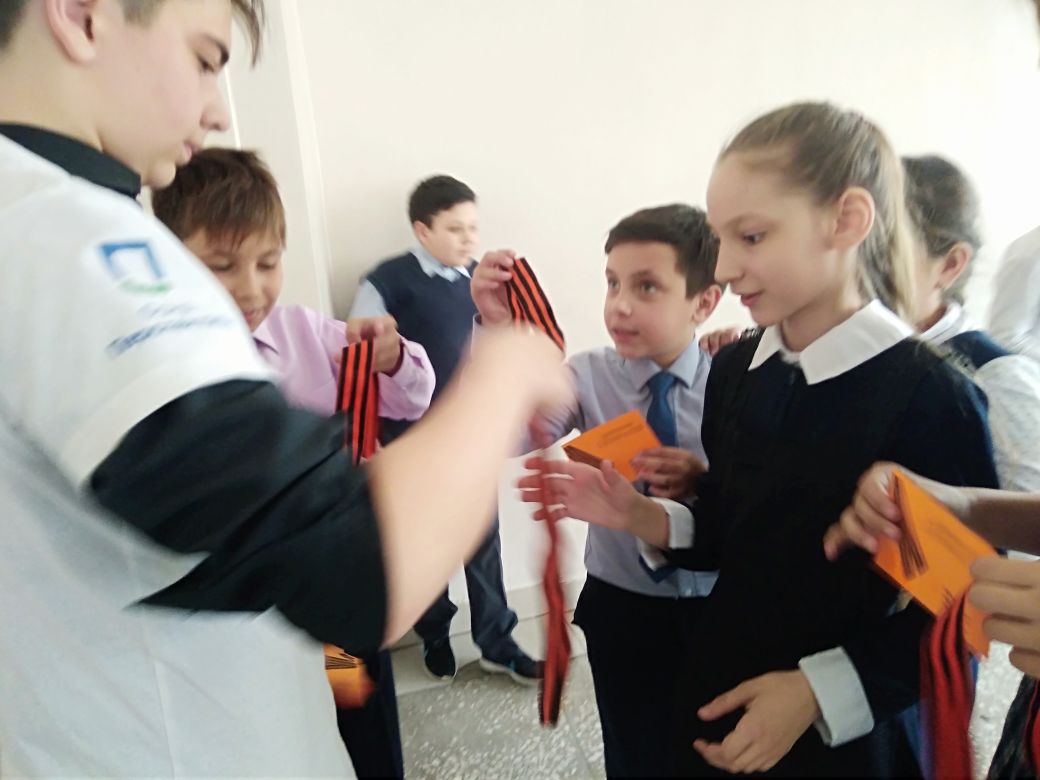 “Җиңү адымнары” исемле республика проекты кысаларында безнең мәктәп волонтерлары “Георгий тасмасы” акциясенә старт бирделәр. Алар Россия тарихы буенча, георгий тасмасы тарихы буенча сорауларга дөрес җавап биргән укучыларга георгий тасмалары өләштеләр. Дөрес җавап бирә алмаган укучыларга Акция символын дөрес тагып йөрү кагыйдәләре язылган листовкалар бирделәр.
