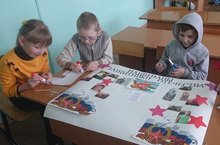 Ученики 1в класса каникулы проводят с пользой. Приближается 23 февраля и учащиеся решили приготовить папам сюрприз, сделать коллаж "Наши папы Защитники Отечества". Ребята принесли фотографии пап, нашли и вырезали картинки и поздравления, и с большим желанием всё приклеивают на плакат, очень интересно какой будет результат.