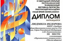 В одном из туров, который проходил в городе Набережные Челны, наш педагог по музыке Людмила Максимовна Федорова заняла почетное 3 место. По итогам этого тура, Людмила Максимовна приглашена принять участие в суперфинале, который пройдет в КСК КФУ "УНИКС" (г. Казань) с 10 по 13 ноября 2016г. Желаем ей дальнейших успехов!!! -