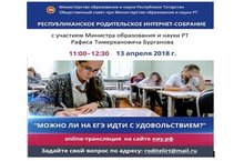 13 апреля 2018 года состоится пятое заседание Республиканского родительского интернет-собрания. Данный проект – совместная инициатива Министерства образования и науки Республики Татарстан и Общественного совета при Министерстве образования и науки Республики Татарстан. Тема заседания – «Можно ли на ЕГЭ идти с удовольствием?» Модераторами заседания выступили Заместитель Премьер-министра Республики Татарстан – Министр образования и науки Республики Татарстан Рафис Тимерханович Бурганов.