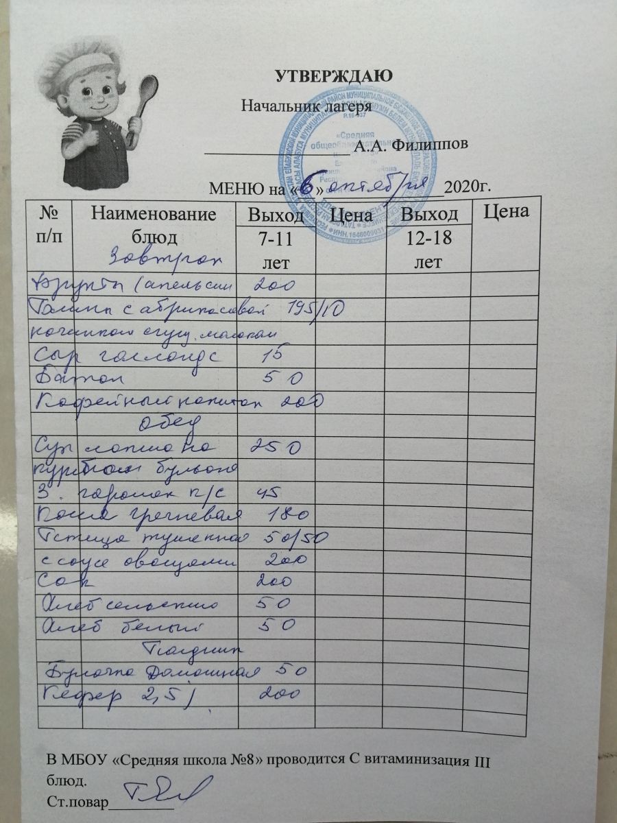 Меню пришкольного лагеря. Мәктәп яны лагере өчен меню 06.11.2020