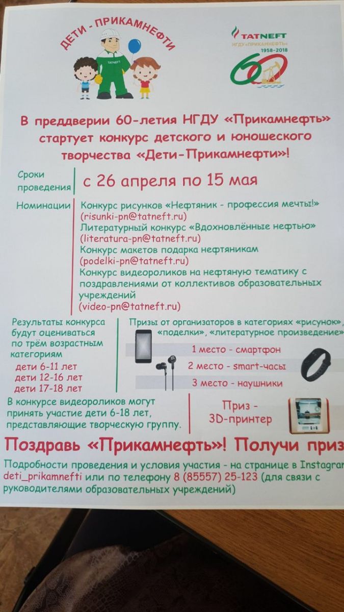 26 нчы апрельдән 15 нче майга кадәр НГДУ “Прикамнефтькә” 60 ел тулу уңаеннан балалар һәм яшьүсмерләр арасында рәсемнәр бәйгесе игълан ителде.