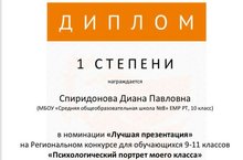 Спиридонова Диана, ученица 10 класса стала победителем 1 степени в номинации "Лучшая презентация" на региональном конкурсе для обучающихся 9-11 классов "Психологический портрет моего класса". Желаем успехов!