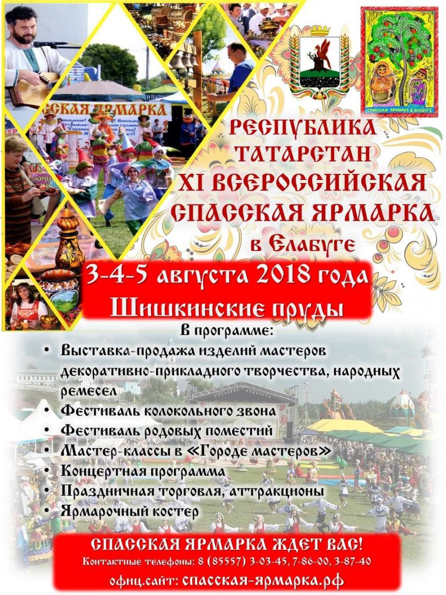 С 3 по 5 августа 2018 года в Елабуге будет проходить XI Всероссийская Спасская ярмарка. По установившейся традиции ярмарка проводится на территории заповедной части Елабуги в районе Шишкинских прудов, стадиона «Молодёжный» и центральных улиц в исторической части города. -
