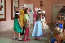Шли мы речками, морями,Царь Нептун встречался с нами,Передал он всем поклон,Скоро в гости будет он.Занимайте все места,Праздник начинать пора. -