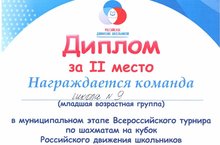 Поздравляем с победой! Младшая возрастная группа СОШ №9 по шахматам заняла 2 место в муниципальном этапе всероссийского турнира по шахматам на кубок РДШ. Руководитель группы Гирфанова А.Ф.