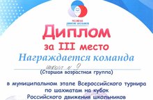 Поздравляем с победой! Старшая возрастная группа СОШ №9 по шахматам заняла 3 место в муниципальном этапе всероссийского турнира по шахматам на кубок РДШ. Руководитель группы Гирфанова А.Ф.