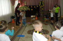 В спортивном мероприятии "Осенние игры" были проведены веселые эстафеты с детьми старшей и подготовительной групп..Дети закрепили знания о пользе фруктов и овощей, повторили названия листьев различных деревьев,прыгали через лужи в калошах с зонтиком.Всем было весело и болельщикам и соревнующимся!
