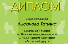 Подведены итоги второго международного литературного конкурса "Лохматый друг". Ученица 5 класса Лысанова Татьяна стала дипломантом 2 степени в номинации "Мои питомцы". Поздравляем победителя и желаем дальнейших творческих успехов!