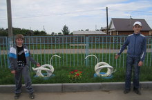 Вот такие красивые лебеди пасутся на зелёной травке перед зданием школы.