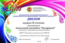 Безнең «Задоринки» вокаль ансамбле «БЕЗ БЕРГӘ" Республикакүләм балалар халык иҗаты фестиваль-конкурсының зона этабында 2 дәрәҗә лауреат булды, Исаншина Мария – 1 дәрәҗә лауреат исемен яулады.
